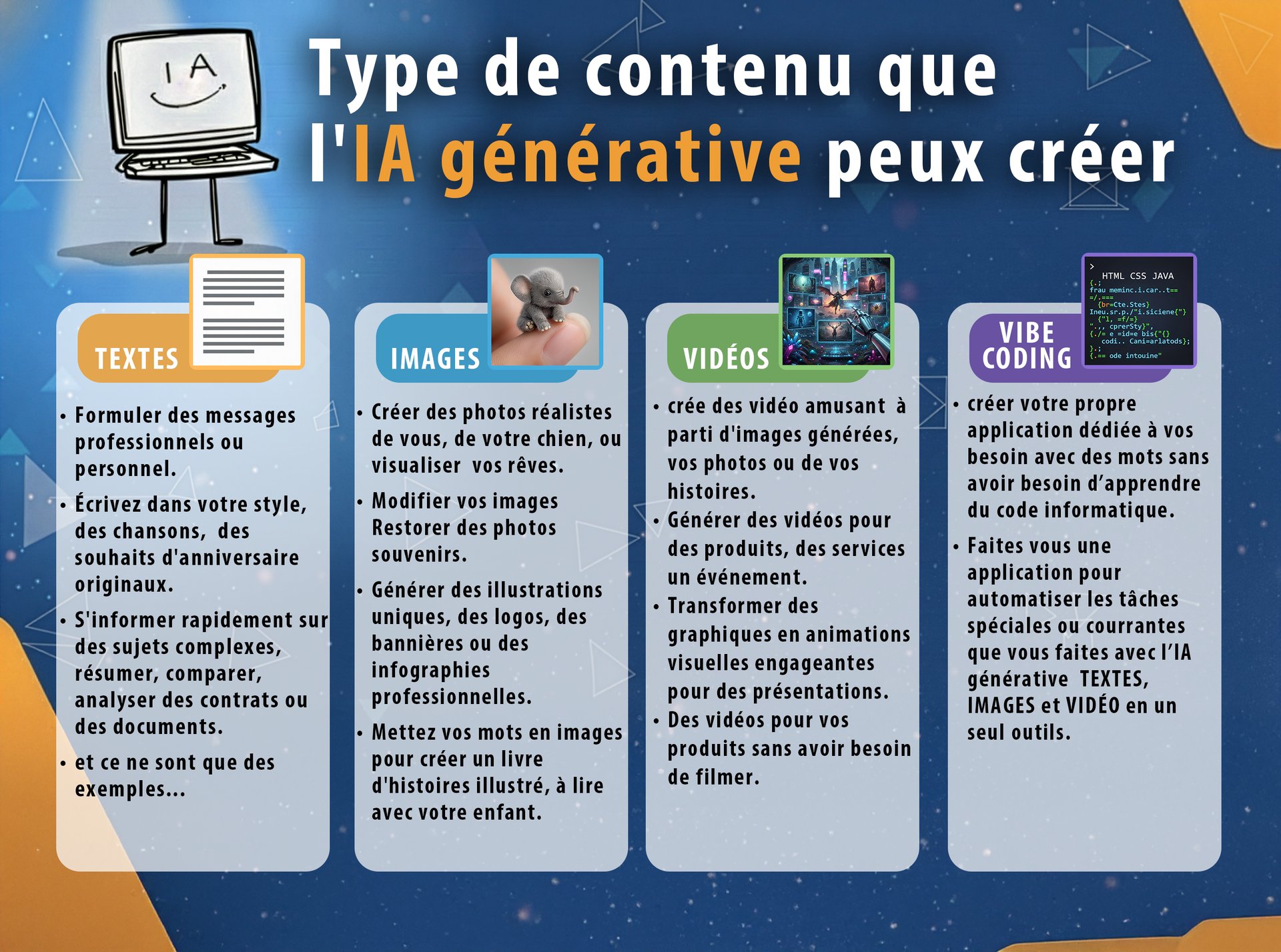 "Je suis un passionné d’IA générative prêt à vous accompagner avec vos projets créatifs personnels et professionnels."